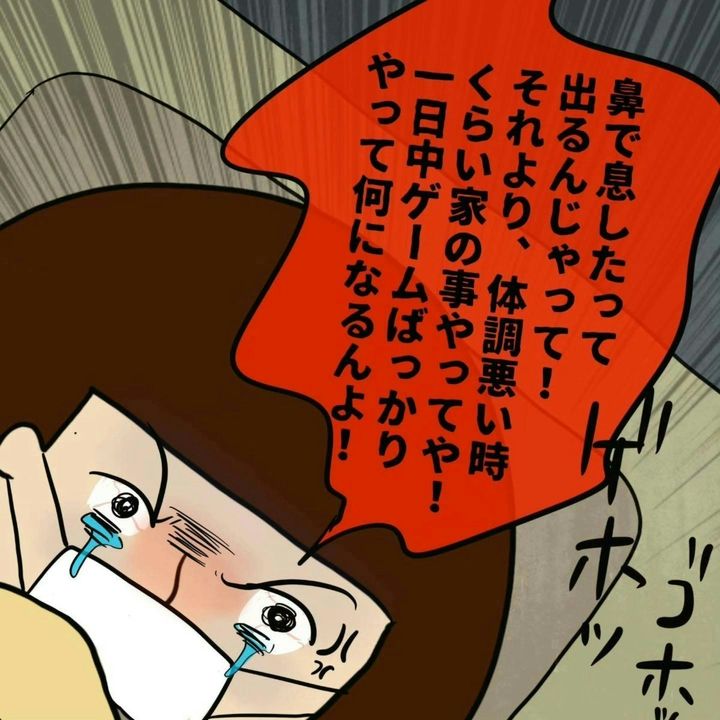 案の定、義父から風邪をもらってしまった、ずんさん。配慮に欠ける義実家とゲームばかりする夫に対し、ついに怒りが爆発してしまいました。