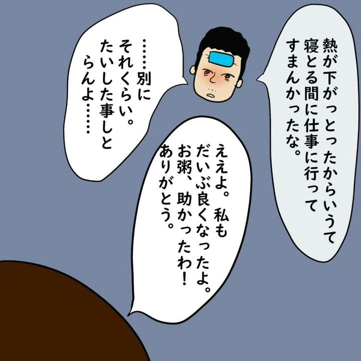 ですが、文句を言いながらも、夫はずんさんのためにおかゆを用意して仕事に出かけます。睡眠と栄養をとり、少しずつ体調が回復しますが、今度は夫が寝込んでしまいました。