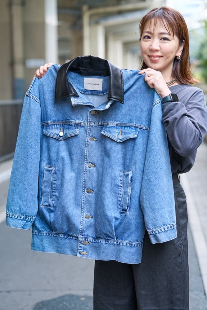 AEWEN MATOPFのデニムジャケットは付け外しができるレザー衿がポイント。長め丈でリラックス感あるシルエットなのでカジュアルになりすぎず、オトナっぽく着こなせます。