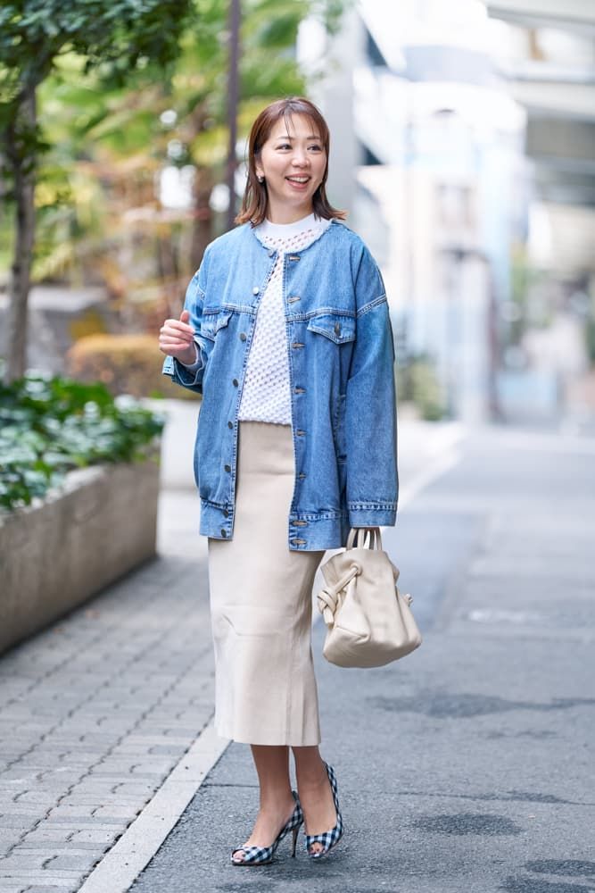 春本番な暖かい日は風通しのいいスカートスタイルで。網目模様のサマーセーターで少し肌が透け見えさせてオトナっぽい抜け感を意識。着回したデニムジャケットはレザー襟の取り外しが可能なので、襟を取って丸襟を見せ、優しく柔らかいフェミニンな雰囲気に寄せてみました。足元はチェックのパンプスでアクセントを付けました。