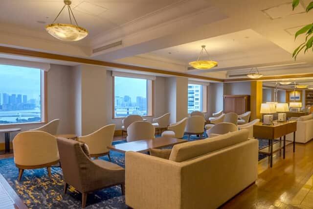 フローリングされた床にカーペットが敷かれた View Lounge on 27th。人の少ないラウンジなので、東京湾岸の景色をながめながら会話やソフトドリンクをゆったりと楽しめます。