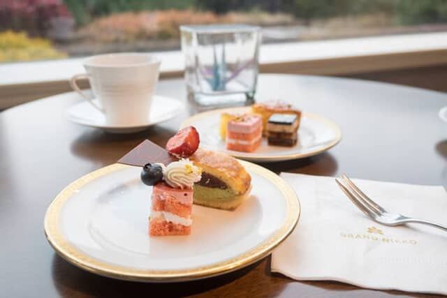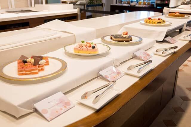 10時から16時30分まではティー&アフタヌーンティータイム。15時からのチェックインを済ませた後に訪れると、ビュッフェ台には5種類のケーキが並んでいました。