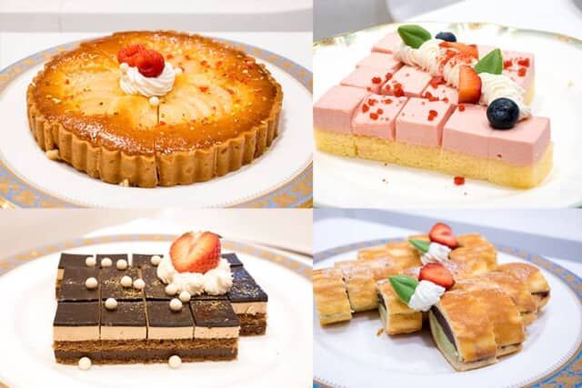 ケーキはホテルのペストリーから運ばれる本格的な味わいです。この日は左上から時計まわりに洋梨を使った「ポワールタルト」のほか、「ラズベリーココ」「生どらやき 抹茶風味」「オペラ」などが用意され、ウェルカムスイーツとしてドリンクとともにいただきました。