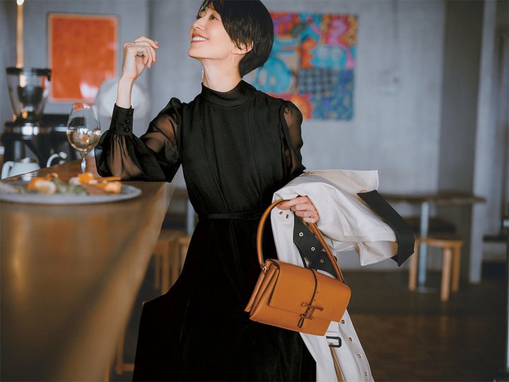 ローファー¥146,300〈H=2cm〉バッグ¥289,300(ともにトッズ/トッズ・ジャパン)ワンピース¥198,000(FOXEY/FOXEY 銀座本店)コート¥264,000(マッキントッシュ/マッキントッシュ ギンザシックス店)ピアス¥40,700ピアス¥44,000リング¥72,600(すべてHirotaka/ヒロタカ 表参道ヒルズ)