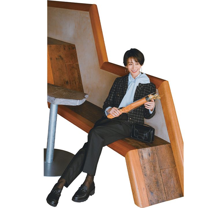 ローファー¥24,900〈H=5.5cm〉(マッキントッシュ フィロソフィー/モーダ・クレア)ブラウス¥59,400パンツ¥49,500(ともにエステータ/オンワード樫山 お客様相談室)ジャケット¥52,800(エストネーション)ピアス¥42,900(マリハ)リング¥96,800(ヴァンドーム青山/ヴァンドーム青山 プルミエール 伊勢丹新宿店)バッグ¥152,900(ピエール アルディ/ピエール アルディ 東京)ソックス¥3,080(マルコモンド)