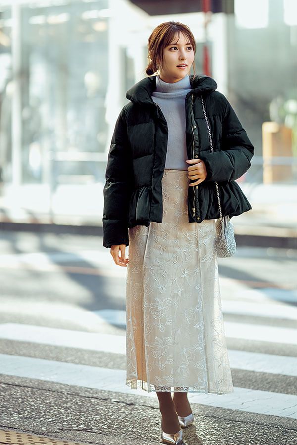 3. 防寒しながら春を意識♪まとうだけで軽やかに見える【刺しゅう花柄】スカートで抜け感を