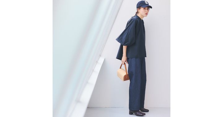 キャップと甘ブラウスを違和感なく繫げてくれるのは、濃紺デニムの成せる技。ワントーンながら、素材・テイストをMIXさせた甘スポーティコーデ。