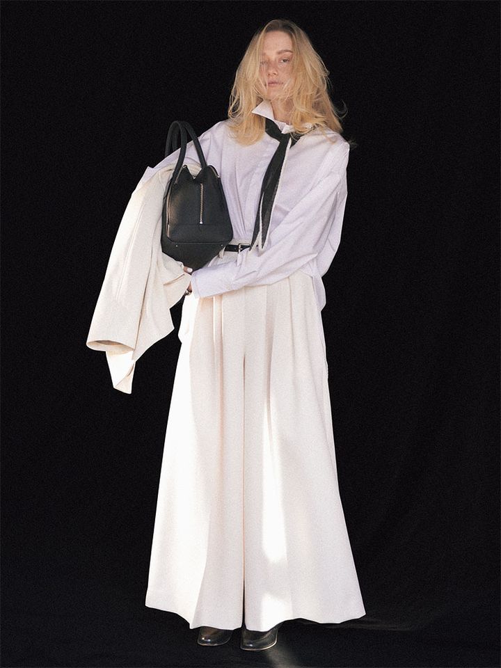 フレアスカートさながらのインパクトを生むワイドパンツ。トリプルクロスのポリエステル素材は、ライトな穿き心地ながらシルエットをくっきりと表現し、ドレスライクなルックスを形成。強気なフォルムにまじりけのない白も手伝って、ゆるくてもルーズさとは縁遠い1本。 白パンツ/エイチエルエム(ヒューエルミュージアム ギンザシックス) 白シャツ/サヴィル