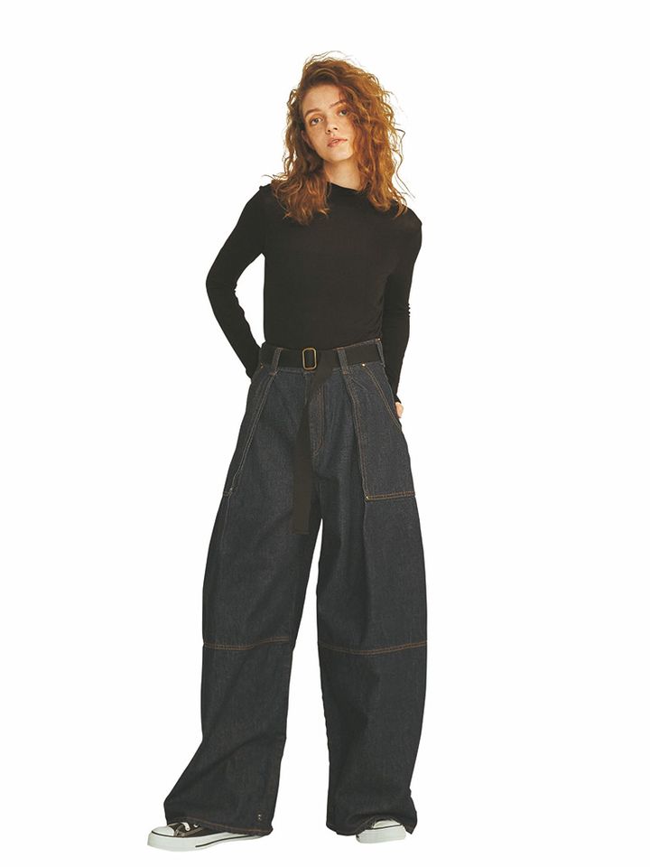 ベイカーデザインを模したフロントタックと、ひざ上の切り替えが立体的なバルーンシルエットを形成。すその後ろにあしらったボタンをとめると形が大きく変化し、どんな靴とでも美バランスをキープ。スニーカーと一体感が出せる幅広なすそ。要所のステッチが、間のびを防ぐ。 タックバルーンワイドデニムパンツ/SOMETHING(エドウイン・カスタマーサービス)
