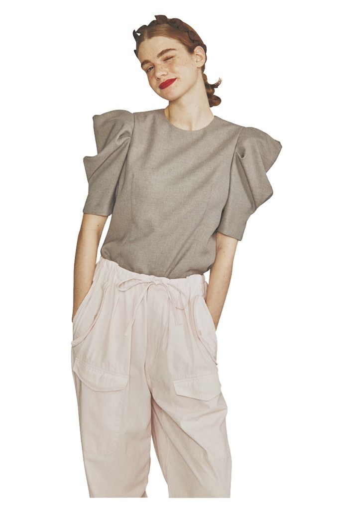 緊張感をともなう構築的な肩のシルエットが目を引く、ドレッシーなトップス。淡いトーンはくずしたくないから、色は甘くも形がボーイッシュなカーゴパンツで、愛嬌をキープしつつ日常に引き寄せ。オールシーズン着用できる軽い素材。 グレートップス/シーニュ