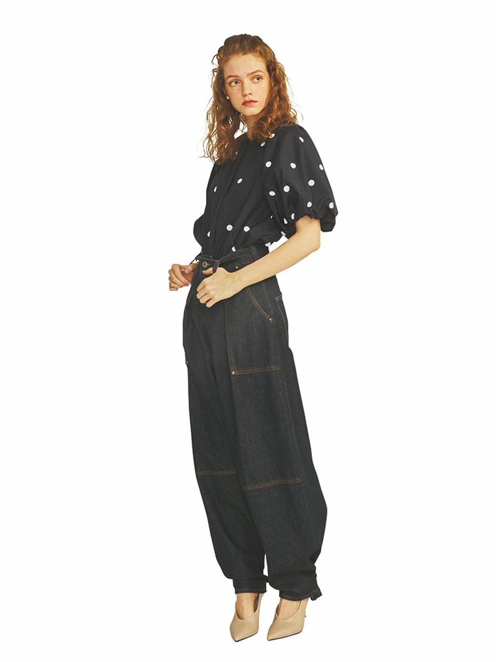 先細ヒールのシャープさが引き立つ足首をキュッとしぼった極端な丸み。足首にもくびれをつくれるありがたいデザイン。より強調された曲線的なテーパードシルエットが女らしい見た目をあと押し。 タックバルーンワイドデニムパンツは着まわし。 ドット柄ブラウス/RIKO(RIKO Tokyo)