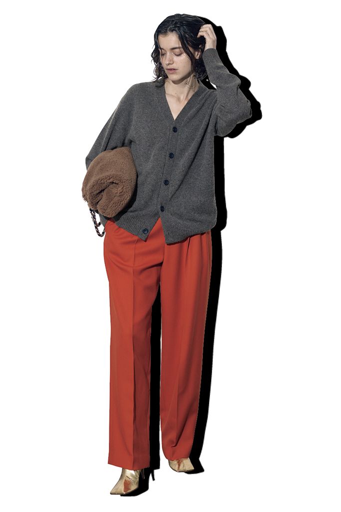 グレーニットのあいまいな色みで、オレンジパンツのインパクトをぼかして。インナーは重ねず素肌をのぞかせれば、派手色ボトムをナチュラルなムードでまとえる。