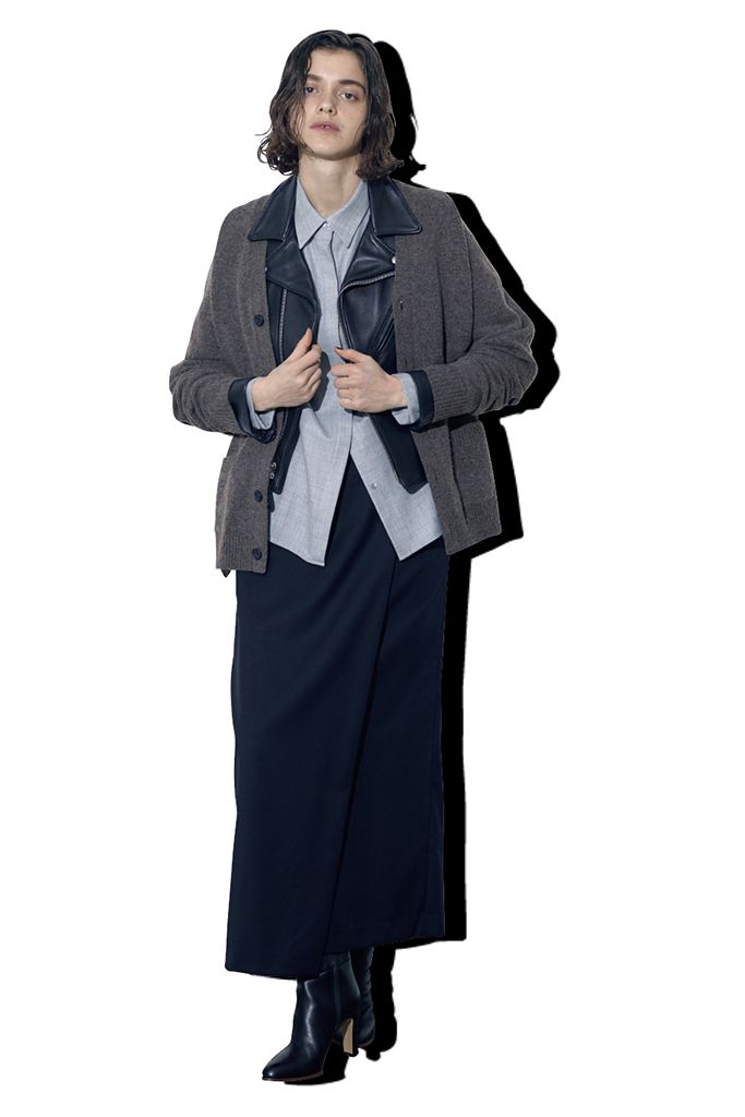 グレーニットカーディガンは着まわし。グレーシャツ/martinique(マルティニーク ルミネ横浜) ライダースジャケット/グリードインターナショナル×ショット(グリードインターナショナル トウキョウストア) 黒スカート/PROTAGONISTA(アマン) 黒ロングブーツ/ダイアナ(ダイアナ 銀座本店)