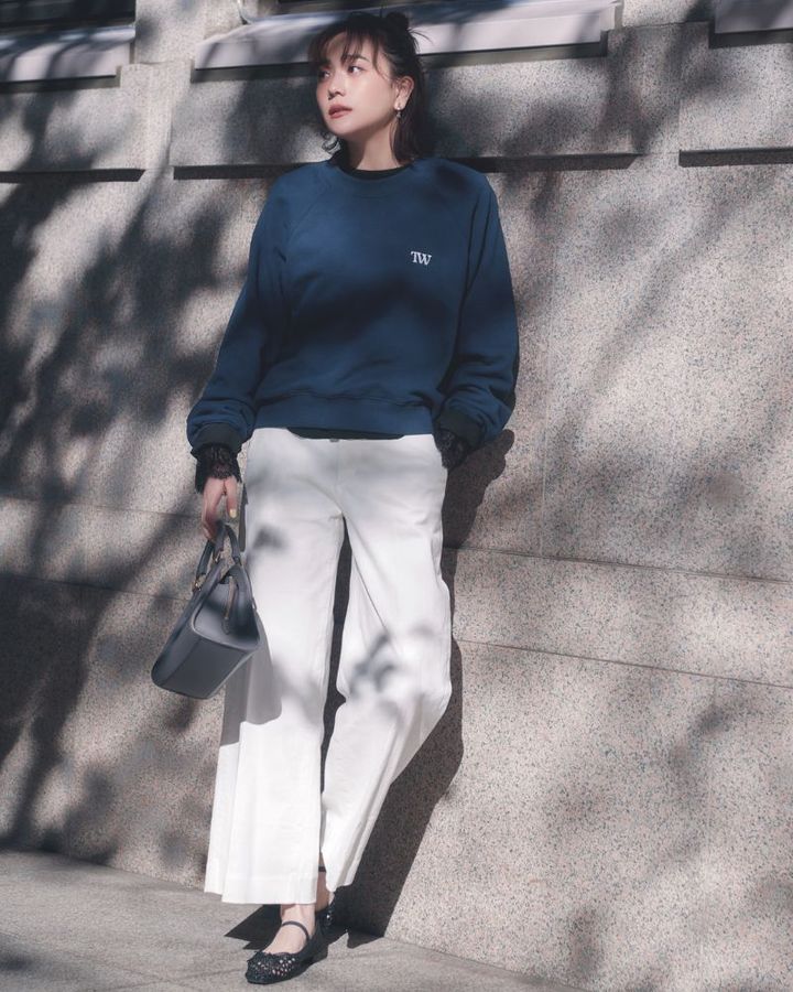 オンオフ両方で取り入れられてコスパ最強なユニクロパンツを今期も更新するなら、ハリのある白デニムがおすすめ。ワイドなフォルムが大人の余裕と気品を宿してくれます。ボトムスがかっちり見えするぶん、トップスはスウェットをゆったり合わせたバランスでオシャレの感度を格上げして。カジュアル素材同士でも「白×ネイビー」の配色なら、手抜き感なく着こなせます。