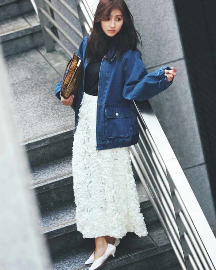 甘め代表格の白レーススカートを取り入れるときは、辛口アイテムとあわせてコンサバ見えしないよう注意が必要です。アウターはブルゾン型のデニムジャケットを羽織って、無骨な印象を。さらに黒ニットをインナーに仕込んで、甘さ加減をグッと引き算するとうまくいきます。仕上げにポインテッドトウのパンプスやレザーバッグを効かせて、キリッと大人ハンサムなスパイスを。