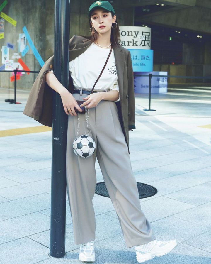ジャケット¥13,000(Olu.)カットソー¥5,990(Gap)パンツ¥26,400(ドレスレイブ/ジオン商事)ベルト¥58,300〈DÉHANCHE〉手に持ったチェーンバッグ¥28,600〈バウム・ウンド・ヘルガーテン〉(ともにS&T)ショルダーバッグ¥15,500(トゥティエ)靴¥33,000(Salomon/atmos pinkflagship Harajuku)イヤリング¥1,540(アネモネ/サンポークリエイト)ネックレス¥12,650リング¥11,550(ともにココシュニック オンキッチュ)