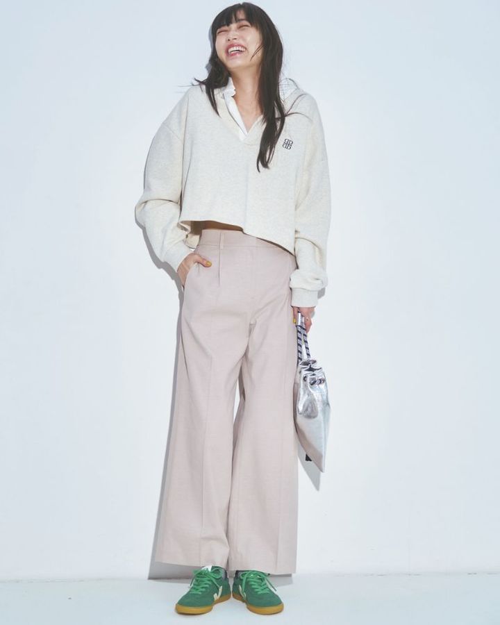 ぽかぽか春めくこの時季に公園デートをするなら、ユニセックスな着こなしがおすすめ。ラガーシャツならトレンド感も演出できて、気負わない距離感に。マニッシュにならないようパンツはベビーピンクを選んで、華やかさを意識するとうまくいきます。さらにグリーンのスニーカーやメタルバッグを投入して、モードな着こなしの中に大人の遊び心を。