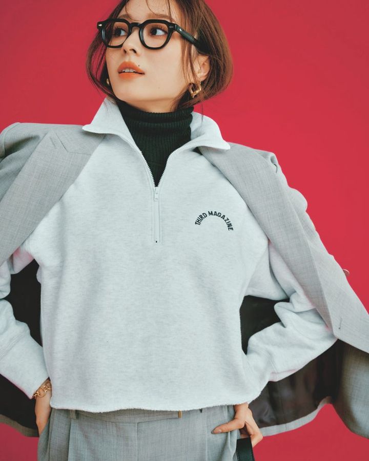 スエットトップス¥27,500(THIRD MAGAZINE)タートルニット¥27,500(スローン/ザ ショップ スローン 新静岡セノバ店)ジャケット¥80,300パンツ¥50,600(ともにエブール/リトルリーグ インク)メガネ¥48,400(モスコット/モスコット トウキョウ)ピアス¥28,600 ブレスレット¥34,100(ともにローラ ロンバルディ/八木通商)