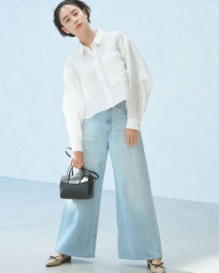 脱カジュアルでキレイめにデニムパンツを着こなすなら、薄色で上品に春らしく取り入れて。フィット感のある腰回りと裾にかけて広がるワイドフレアのディテールが、女性らしさとスタイルアップを叶えてくれます。トップスは白のジャガードを効かせた立体シャツで、エレガントに昇華。短丈ならデニムの落ち感も際立ち好バランスです。小物は黒で統一させたりパールやドットを散りばめて、大人可愛く。
