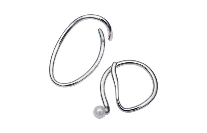 ”耳元に陰影を”をテーマに生まれた、〈エテ〉のシェイドカフ。右は、耳の中ほどに引っ掛けるようなつくりで、華奢な一粒のパールがアクセントに。左のシンプルな曲線が美しいカフは、程よい主張で顔まわりに華やかさをプラス。ともに、着けたときに耳の後ろに影が落ちるように見える、ニュアンスのあるラインが印象的。どんな装いにも個性を与えてくれる。
