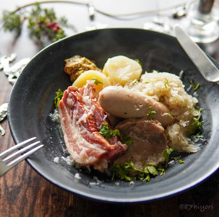 @87hiyoriさんは、ベーコンやヴァイスヴルスト(白ソーセージ)、蒸し豚、じゃがいもとシュークルートを一緒に煮込んで。キャベツのさわやかな酸味がそれぞれの具材と調和して、奥深い味わいを奏でます。