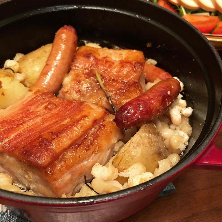 お肉とソーセージは外はパリッで中はジューシー、じゃがいもと玉ねぎとニンニク、白いんげん豆はトロほくー!トロほくー!Instagram @sonor28