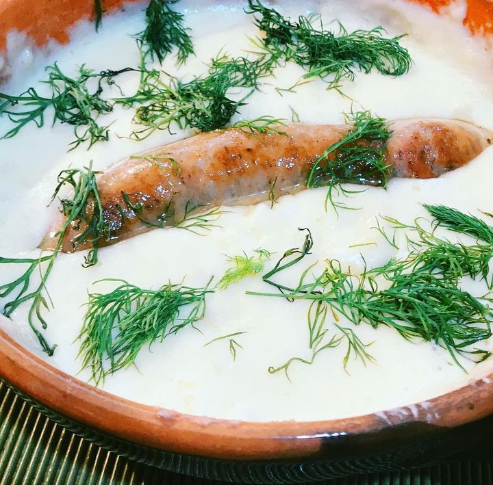 @ironmanmaetin さんは、コンテチーズで作ったアリゴに白いソーセージを添えて。もちもちとした食感がくせになるアリゴは、お酒にもぴったりです。