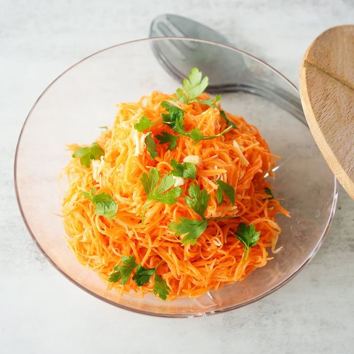 キャロットラペ (Carottes râpées)の「ラペ」はフランス語で「すりおろす」という意味で、粗めのグレーター(おろし器)やスライサーなどで細切りにしたにんじんをドレッシングで和える、フランスの定番お惣菜。