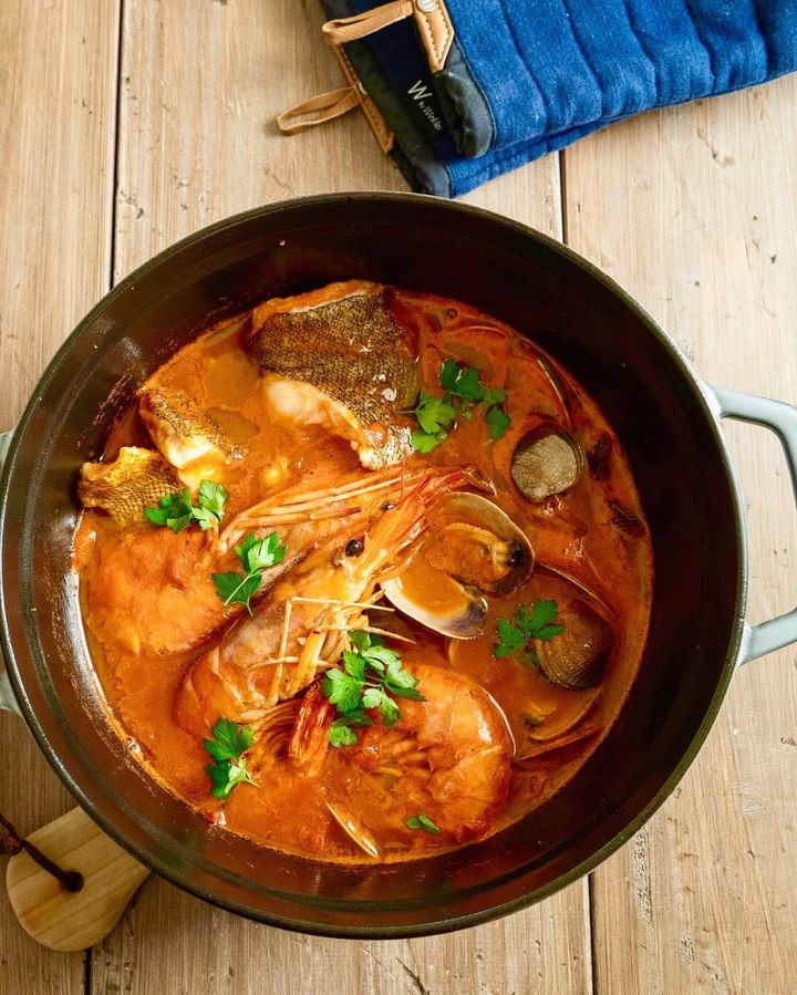 @haruna_takahashi7148さんのブイヤベースは、有頭えびを殻ごとこんがり香ばしく焼いてから、あさりや白身魚などとともにスープに加えるのがおいしさのポイント。魚介の旨味がギュッと濃縮した、最後の一滴まで飲み干したくなる一皿に。