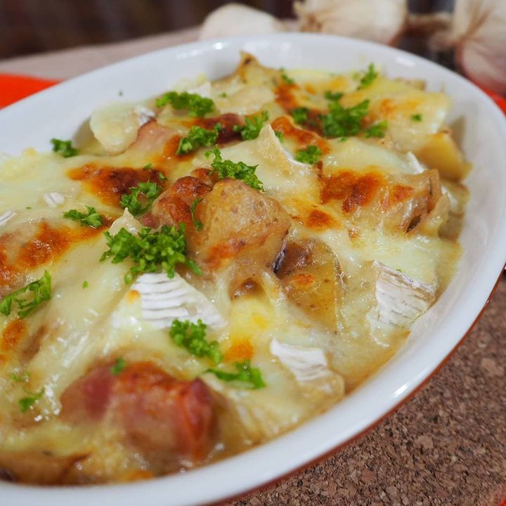 タルティフレット(Tartiflette)は、フランス東部サヴォワ地方の郷土料理。ゆでたじゃがいもに炒めた玉ねぎとベーコン、チーズをのせてオーブンへ。伝統的にはルブロションと呼ばれるサヴォワ地方のチーズが使われます。