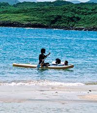 「五島列島で私はサップヨガ、息子と娘は海水浴を。水が大好きな特性があり、娘にとって水遊びは至福の時間」。