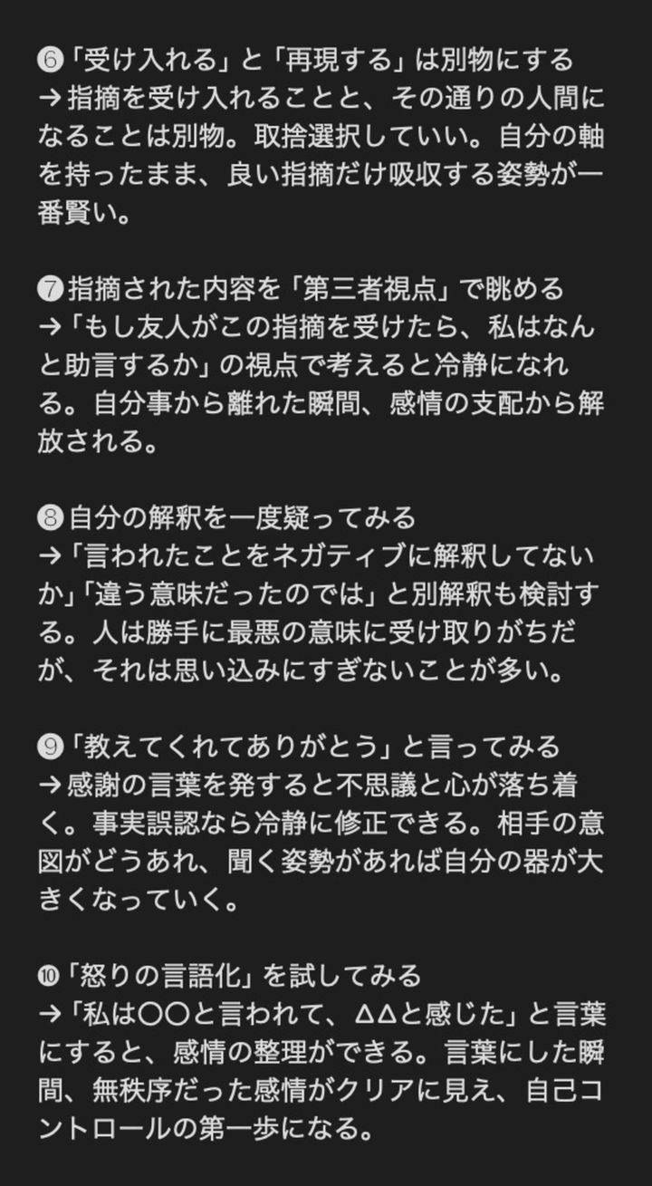 紹介された行動10選から、大きく2つの段階に分けられそうですね。1つは、2・4・9番のように、その場での相手とのトラブルを避ける行動です。指摘されたことに対し深く考える前に4・9番の「なるほど・教えてくれてありがとう、と言ってみる」を試すことで、一呼吸置くことができますよね。