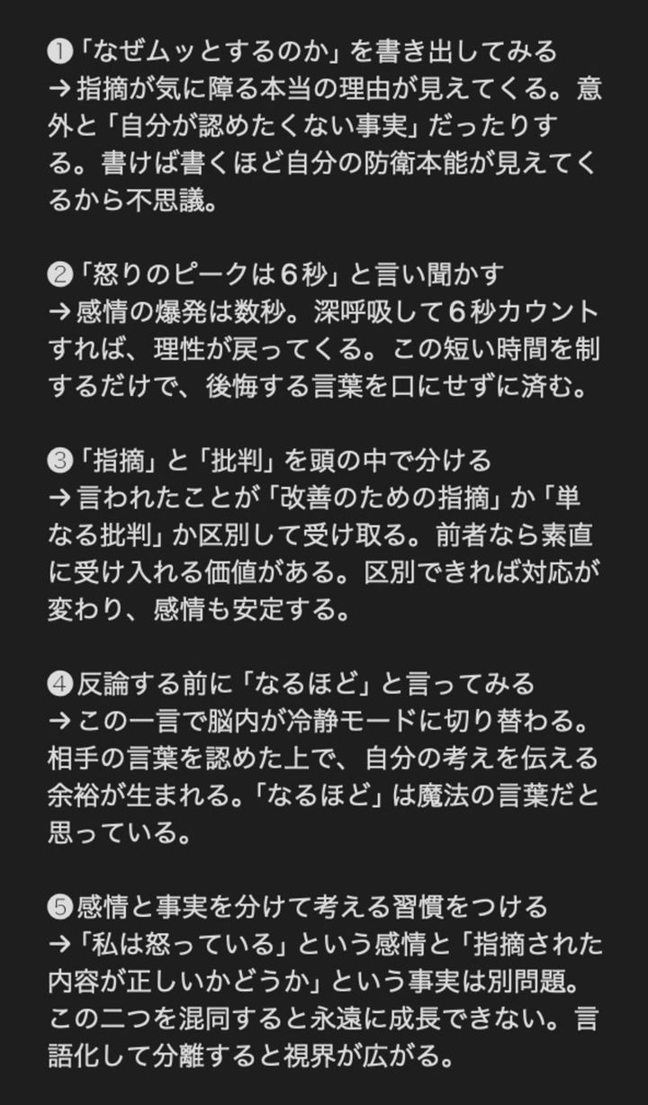 この投稿には「印刷して見返す」「とりあえず怒りの言葉以外を先に言うと落ち着いてくる」といったコメントが寄せられていました。指摘されるとムッとなってしまい困っていた方は、すぐにでも参考にしたい有益な投稿でした。