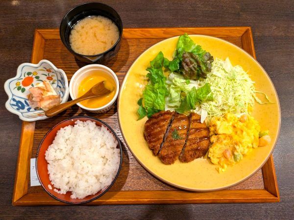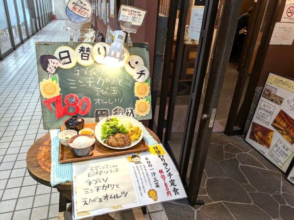 日替わりランチ定食は780円です。お得ですね。本日の日替わりランチは、手づくりミンチカツとえび玉オムレツ!本日の一汁三菜、地域で働く皆様に元気になっていただけるようなランチメニュー。「健康的でボリュームたっぷりの献立をスタッフが日替わりで考えご提案します。」と書いてあります。手づくり料理っていいですね。