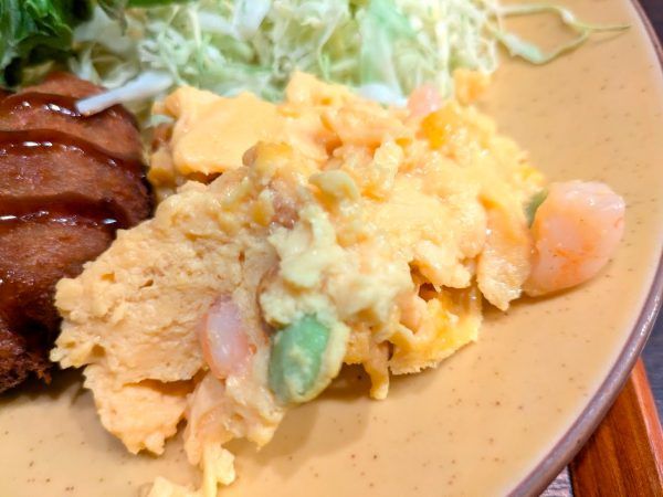 本日の日替わりランチ定食のメインは、手づくりミンチカツとえび玉オムレツに、ミニ冷奴・ミニだし巻き玉子・お味噌汁・ご飯付きです。ご飯は大盛り・おかわり自由です。
