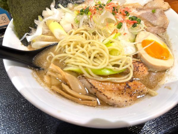 煮干しをガツンと感じるスープで、ストレート麺でも中太なので絡みもいい。たっぷりのトッピングで食感の違いを楽しみながら、最後まで飽きずに食べることができました♪