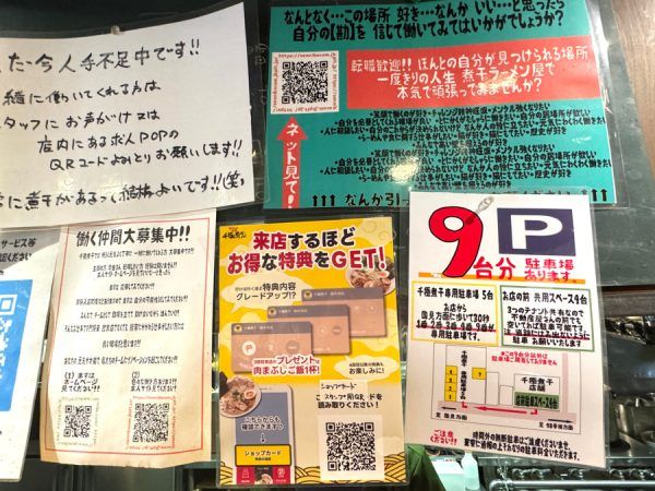 千極煮干さんは9台分の駐車場を完備しているので、車で行けるとこも魅力の1つ。店舗前と徒歩30秒のところにある駐車場があります。