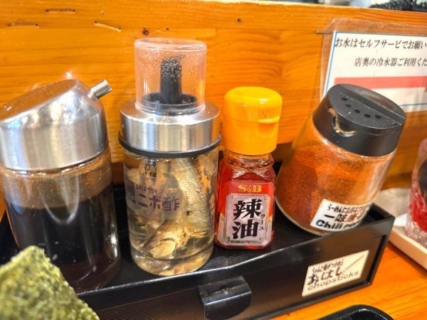 カウンター前には「ニボ酢」というものもありました。初めて見たので絶対に試してみたくて、最後の方で使ってみましたがおいしい! 出汁感があるお酢で煮干しラーメンとの相性抜群でしたよ!