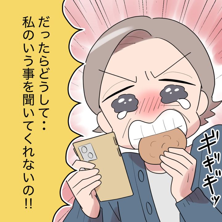 「だったらどうして・・私の言う事を聞いてくれないの!!」涙ながらにおせんべいを頬ばり、ゆうさんに訴える義母です。