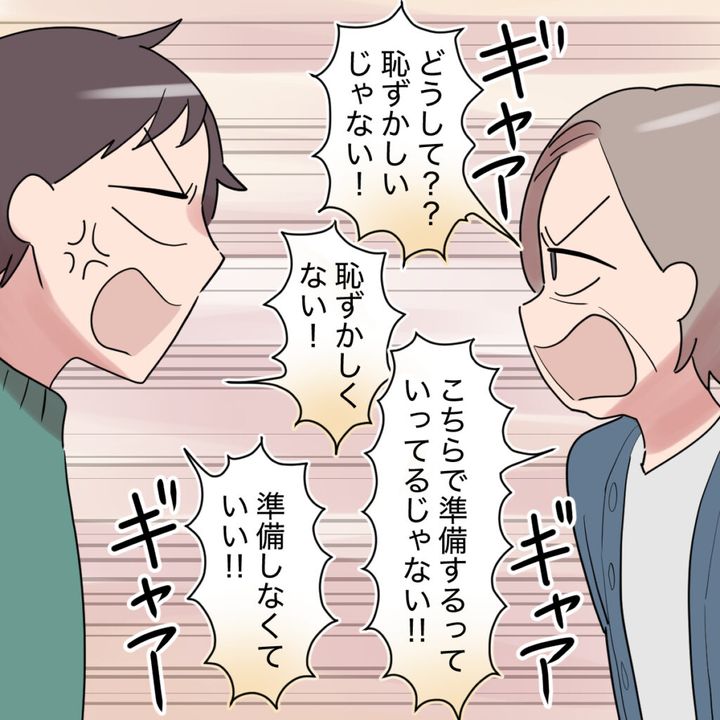 「どうして??恥ずかしいじゃない!」と言う義母に「恥ずかしくない!」とゆうさん、さらに「こちらで準備するっていってるじゃない!!」と引かない義母。ゆうさんは「準備しなくていい!!」と言い返しました。