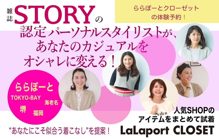 「STORYが街に出る!」をコンセプトにスタイリングサービスを行うイベントです。誌面でも活躍中のSTORY認定パーソナルスタイリストたちが、あなたの体型や雰囲気に合う服を探しながら、トレンドの着こなしをアドバイスします。会場はららぽーと内のさまざまなブランドの中から選りすぐりの旬を集めたセレクトショップ「LaLaport CLOSET」。気にいった服は、その場でららぽーとのECサイト〈&mall〉から購入できるので、手ぶらでSHOPPINGが楽しめます。