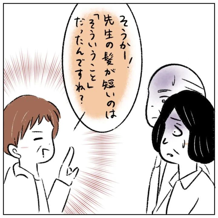 「そうかー!先生の髪が短いのは『そういうこと』だったんですね?」と笑顔で言うお母さんに、何のことを言っているのかわからないといった様子で困惑の表情を浮かべる性根先生と校長先生。