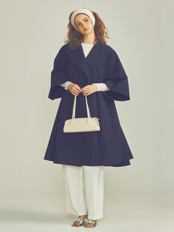 ジャケットライクなえり元で、着るだけできちんと整うネイビーコート。パンツに加えてロングスカートの上にも重ねやすい、Aラインのすそ。タフな生地で美しい広がりをキープ。手元を華奢に見せる太くて短いそでが、ボリューミィなシルエットをバランスよく調整。