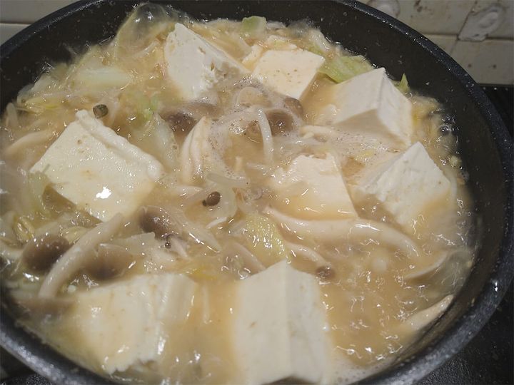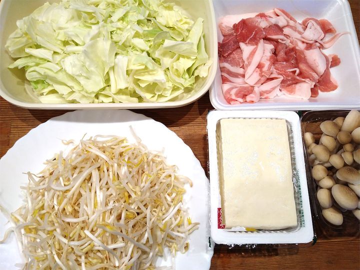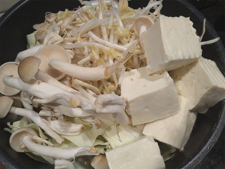 キャベツ、もやし、ぶなしめじ、豆腐を鍋に入れて、火が通るまで煮る。