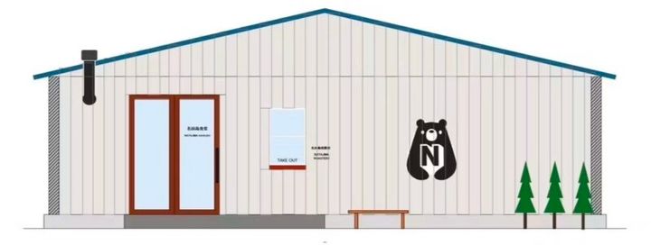 最初に作った店舗図は、農業用倉庫をイメージしました。建設地が田んぼの真ん中なので、まわりの景色に溶け込むように。食堂だけでなく珈琲焙煎所も併設するため、焙煎機の煙突も設置しています。店舗の裏側には、365日変化する田園風景が広がります、この眺めを存分に楽しんでもらうために客席に大きな窓を3つ設置することにしました。食事と珈琲にプラスして素晴らしい景色も楽しんでもらいたいとイメージしました。