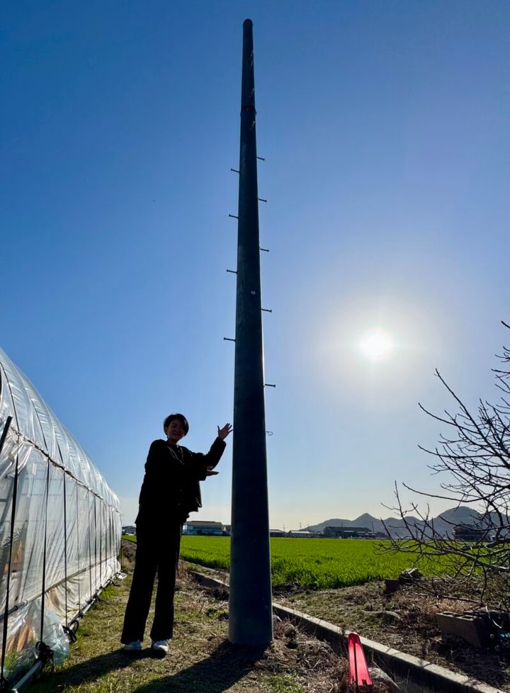 (写真)こちらが店舗敷地内に新しく建てていただいた電柱です。地中に埋まっている部分を見せてもらったり、大きな電柱の工事はなかなかの大迫力でした!