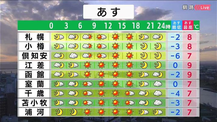 あす1日(火)の時間ごとの天気。道央・道南からです。