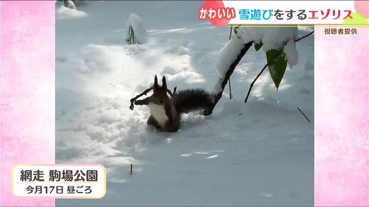 3月17日に網走市の駒場(こまば)公園で撮影された、雪の中であそぶエゾリスです。2週間前なのでまだ雪が多いですね。