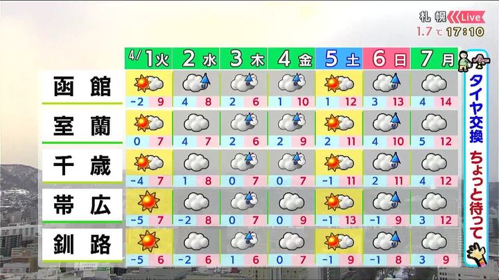 水曜は曇り空で、午後は道南など海岸部の一部で雨が降るでしょう。木曜から金曜は雨や雪が降るため、毎日運転をする方はタイヤ交換はもう少し待った方が安心です。