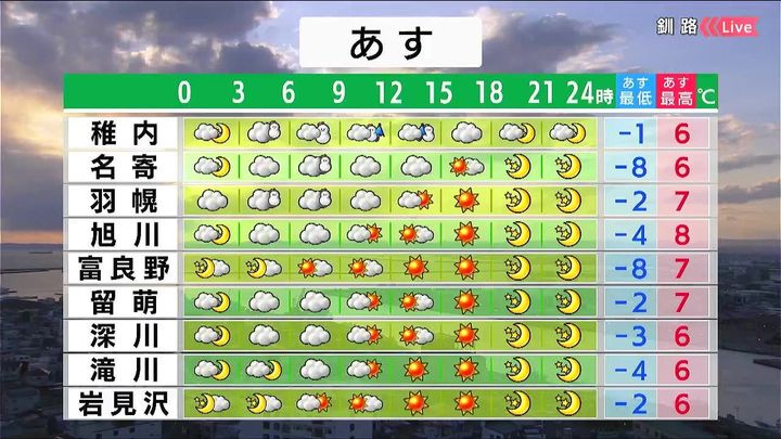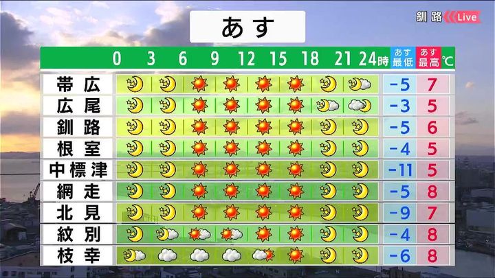 広く晴れて、空気がカラッとします。朝の気温は中標津や北見で‐10度くらいまで下がりますが、日中は7度前後で、オホーツク海側の寒さは緩むでしょう。